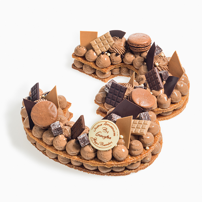 Un number cake est composé d’un fond de pâte sablée suivi d’un fond de feuilletage, intercalés par une crème intense chocolat. Sur le dessus, un décor avec des perles croustillantes, macarons au chocolat, mini tablettes chocolat.